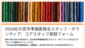 ⇒ 2026杜の宮市準備委員会スタッフ・ボランティア、コアスタッフ登録フォーム (URL https://forms.gle/sPMrM1QSvGxuTUFN7 )