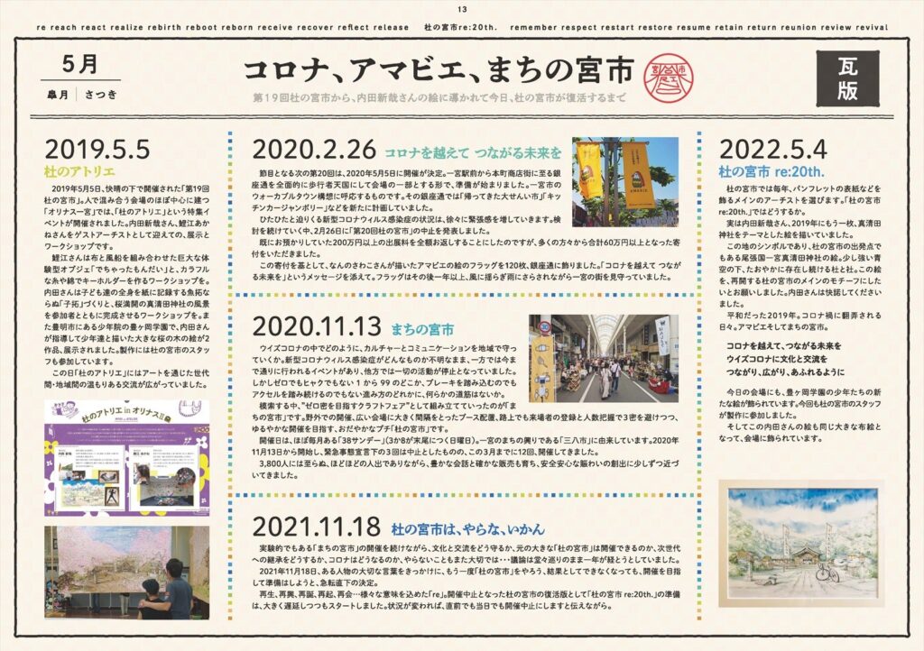 2022年5月4日に開催された「杜の宮市 re:20th」。2020年5月5日に開催予定だった第20回杜の宮市がコロナ禍で中止となり、アマビエのフラッグを駅前に飾り、まちの宮市が生まれ、そして第20回を再度開催されるまでの、ささやかな戦いの記録です。