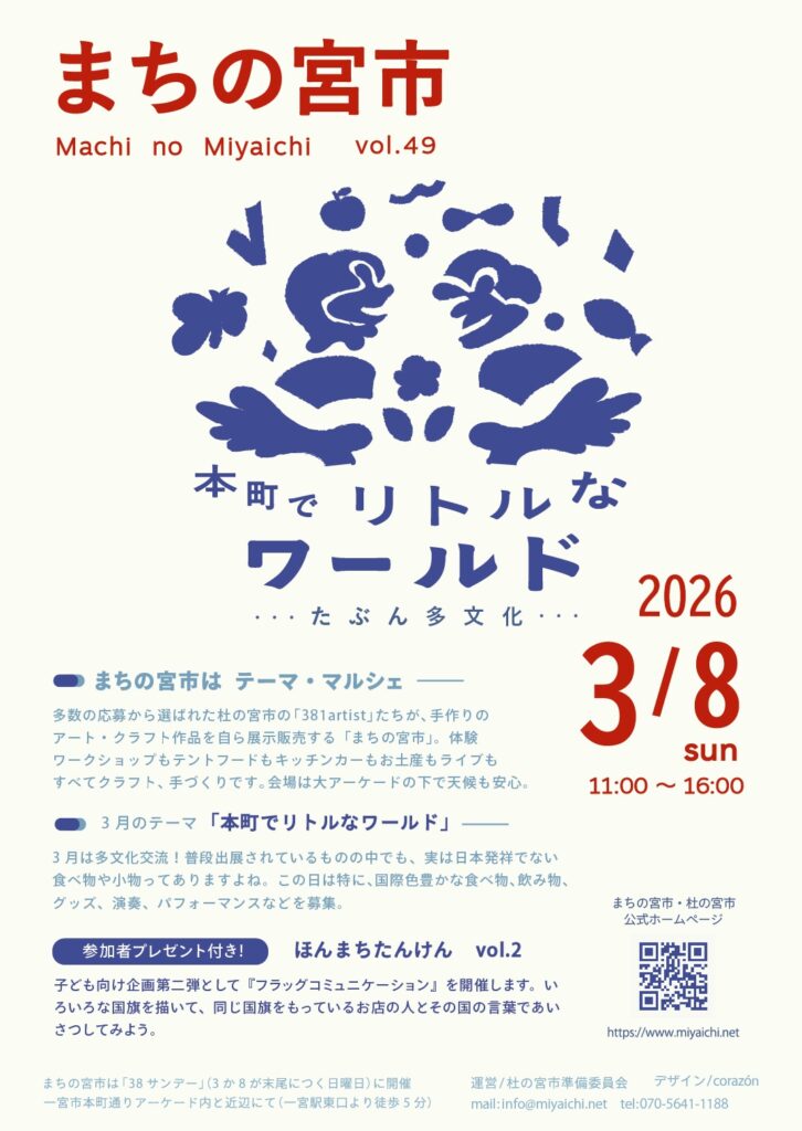 2025年度ラスト、2026年3月8日の「まちの宮市」は「たぶん多文化」をテーマに「本町でリトルなワールド」イベントが開催されます。