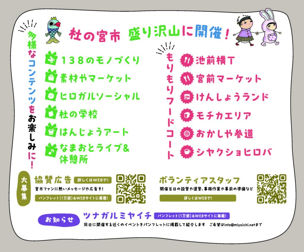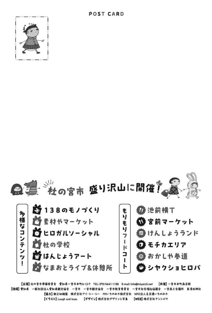 2026年5月3日(日)開催「第24回杜の宮市」の公式ショップカード(名刺サイズ 1万5千枚)とポストカード(葉書サイズ 3万枚)ができてきました。ラフ&クスのポップでファンシーなイラストを、渡辺亮太(ex.デザインと写真)が、素敵な表現に。ショップカードはミヤイチ歴で初めてのタテ型です。