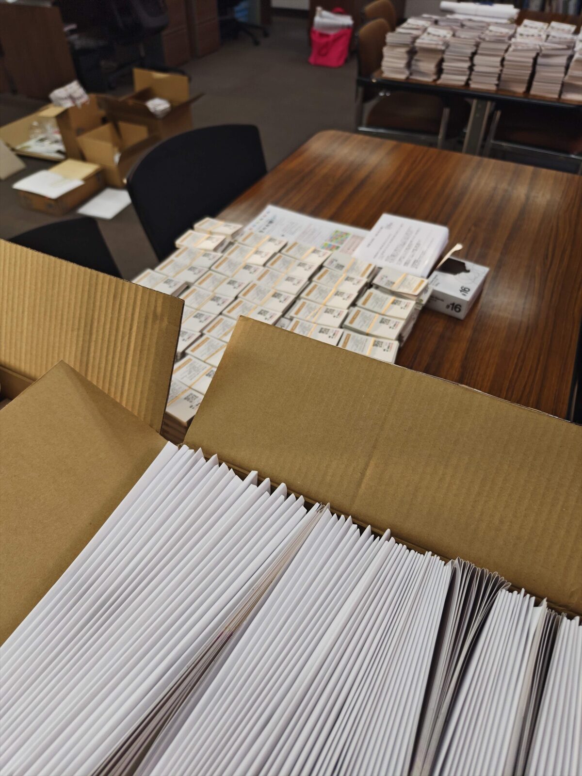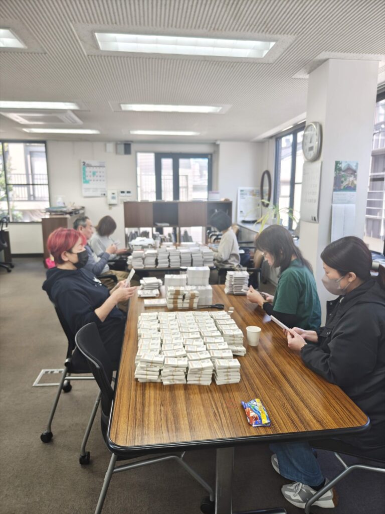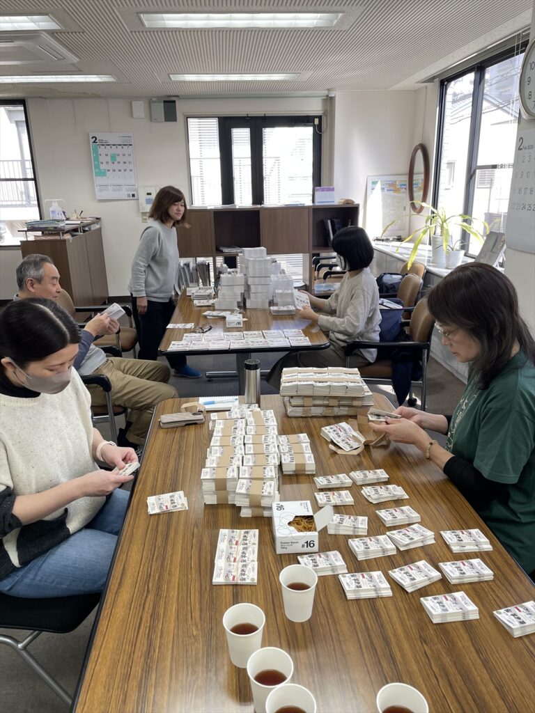 2月28日の土曜日も、フライヤーやポスター、ポストカードやショップカードを、杜の宮市に出展される方や関係者の方、チラシ等を配布してくださる方に送付すべく封筒詰め作業が終日行われました。