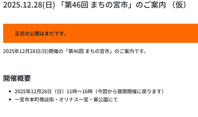 まち宮のテーマ 2025.11.29 2025.12.28(日) 「第46回 まちの宮市」のご案内 (仮) 正式の公開はまだです。 2025年12月28日(日)開催の「第46回 まちの宮市」のご案内です。 開催概要 2025年12月28日(日)11時~16時(今回から昼間開催に戻ります……