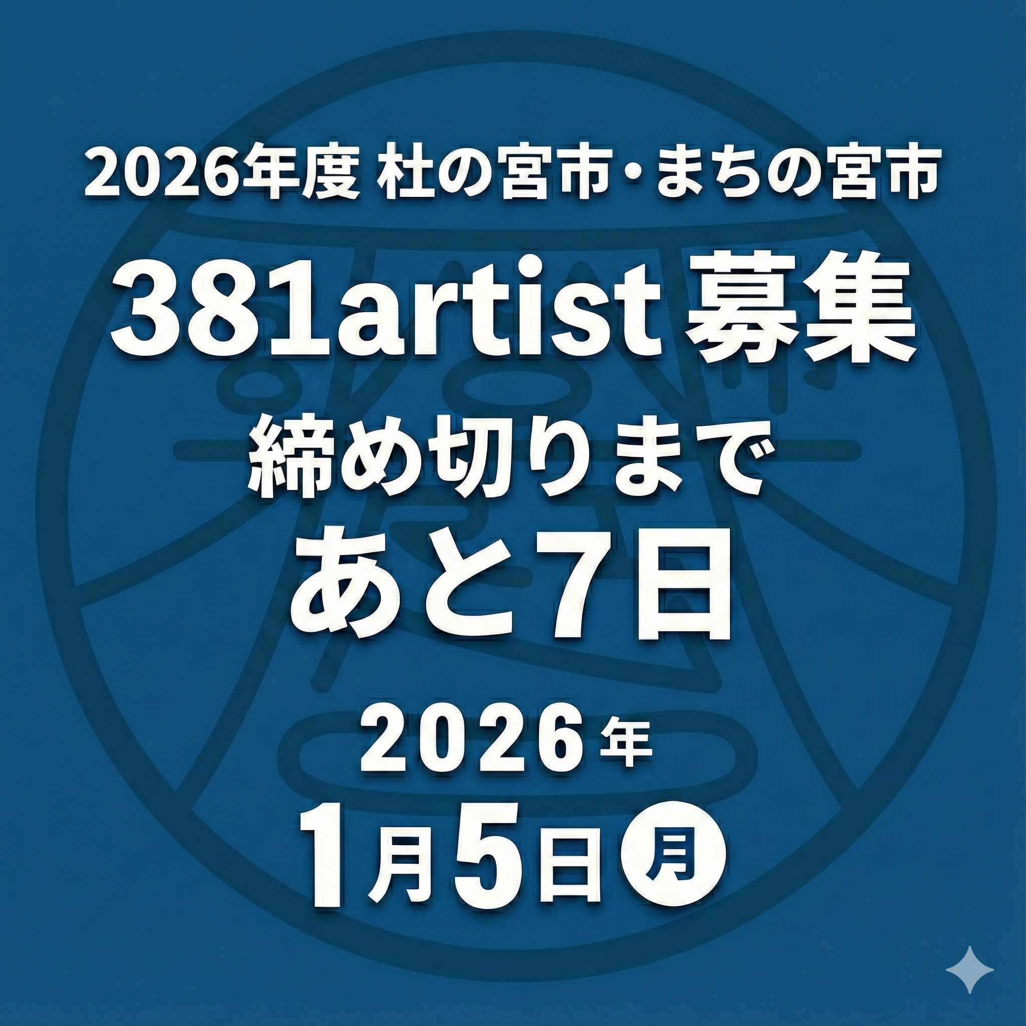 出展・出演者の皆様へ 2025.12.29 【あと7日】「381artist」へのお申し込み受付中! 杜の宮市準備委員会です。いよいよ今年も残りわずかとなりました。 年末のお忙しい時期かと思いますが、来年度の「381artist(ミヤイチアーチスト)」審査へのエントリーはお済みでしょうか?募集……