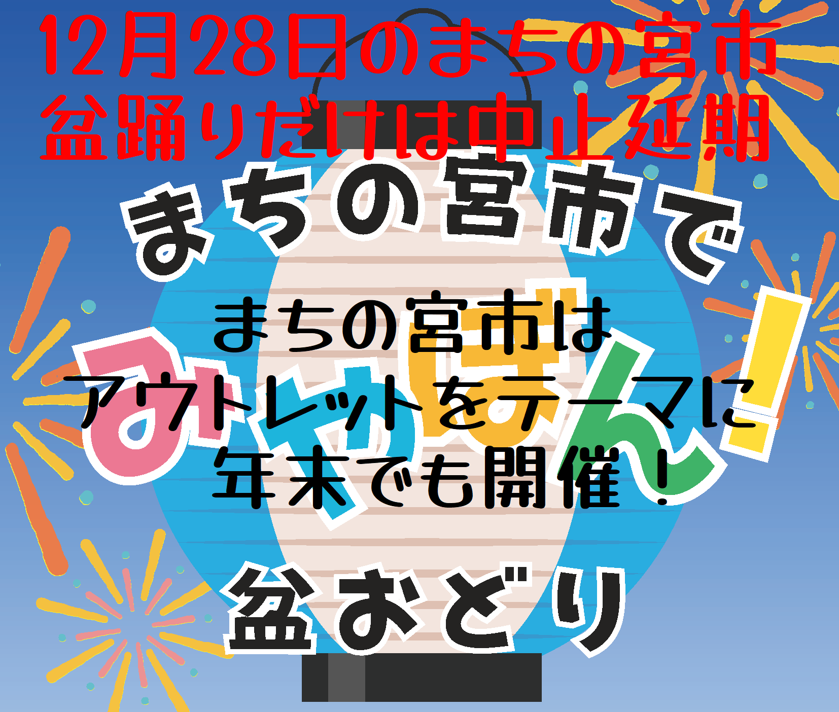 まちの宮市 2025.12.12 「みや盆」は中止(延期)…12月28日のまちの宮市で(まちの宮市は開催) いつも「まちの宮市」へご参加また応援していただき、ありがとうございます。 12月28日(日)開催の「第46回 まちの宮市」にて実施予定でした“踊り納めに みや盆”ですが、会場の調整がう……